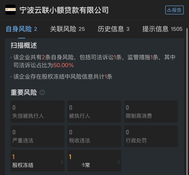 另外,企查查显示,宁波云联小额贷款有限公司(下称“云联小贷”)则遭遇经营异常与股权冻结的双重冲击。
